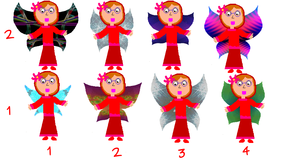 As the blue fairy promised, she gave Jamie wings. Which pair of wings do you like best? (1,1). (2,1). (3,1). (4,1). (1,2). (2,2). (3,2). (4,2).
