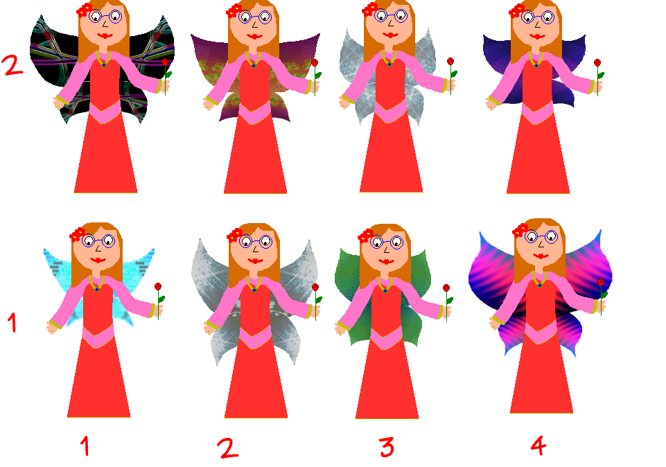 As the blue fairy promised, she gave Jamie wings. Which pair of wings do you like best? (1,1). (2,1). (3,1). (4,1). (1,2). (2,2). (3,2). (4,2).